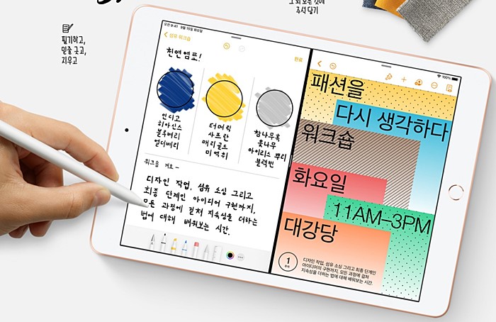 우선 외형 디자인은 아이패드 7세대와 동일합니다. 디스플레이 스펙도 마찬가지인데요. 많이들 기대하시던 라미네이팅 처리도 탑재되지 않았습니다. (참고로 라미네이팅 처리는 전면 터치 유리와 후면 LCD패널을 틈새없이 접착하는 기술을 말하는데요. 이게 없으면 펜슬을 사용할 때 화면과 유리사이에 공간이 느껴져서 붕뜬 필기감이 생기지요. 그래서 아이패드 유저들이 선호하는 기능입니다.)